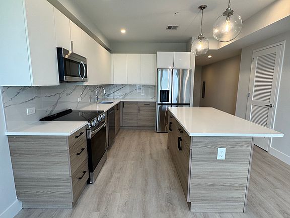 The L-shaped kitchen features an island, stainless steel appliances, two-tone cabinetry, and white quartz countertops. The open layout provides ample room for a dining area and a generous living room. There is a nice entry hallway with a closet. Additional highlights include in-unit washer/dryer, and overhead lighting throughout.