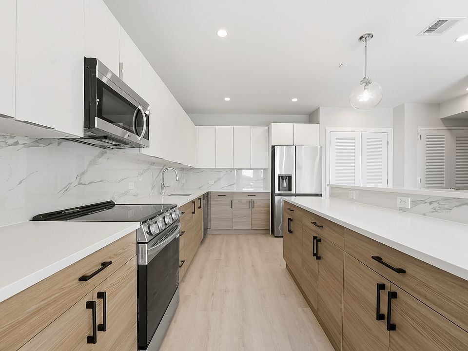 Enjoy a sleek L-shaped kitchen with an oversized breakfast bar, stainless steel appliances, two-tone cabinetry, and white quartz countertops. The open layout offers plenty of space for dining and entertaining, complemented by bright bedrooms and stylish bathrooms.