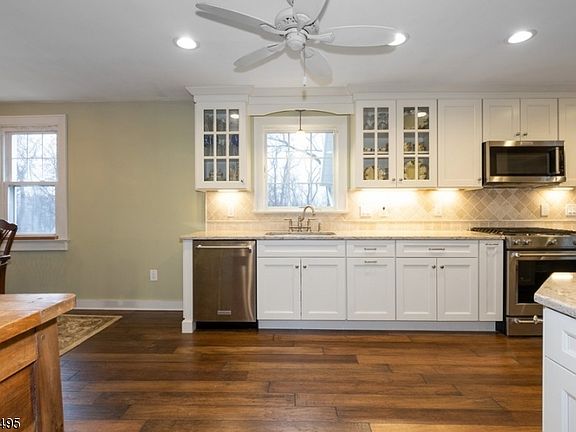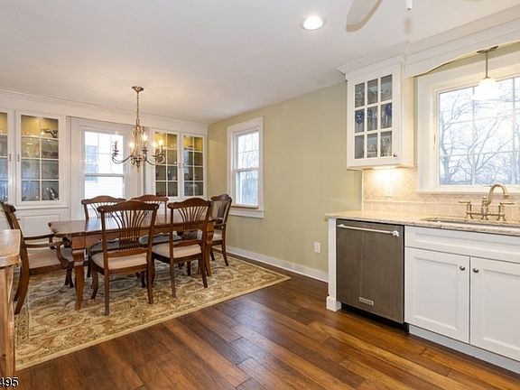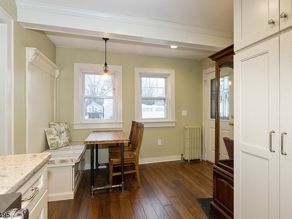 Lovely, updated colonial situated on a quiet street near town and schools. Wrap-around rocking chair front porch. Beautiful eat-in kitchen renovated in 2016 featuring solid maple custom soft-close cabinetry, granite counters, stainless steel appliances and tile backsplash. Wonderful entertaining deck off of kitchen and additional blue-stone patio below. Hardwood floors underneath carpeting. Newer windows. Third story walk-up with loft area and sink, and walk-out lower level. Expansive and private backyard w fenced in area for vegetable garden. Short distance to major highways and train/bus service to NYC. Detached garage is "as is" with storage below. Great location, great value. Square footage is per NJATCB. Walk thru video by available.