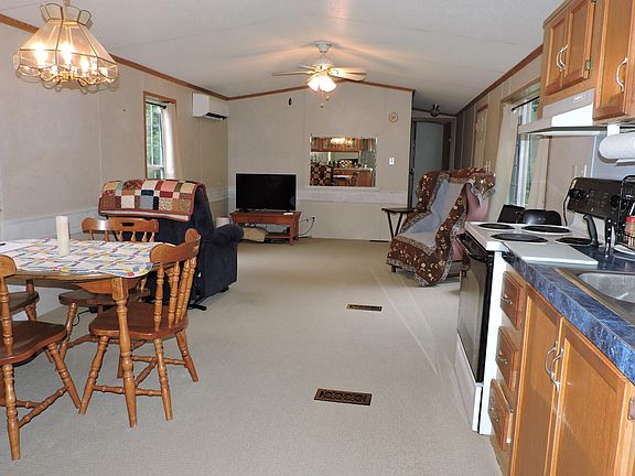 This very well maintained mobile home is neat as a pin and ready for you to call it home. A spacious open concept living room, dining room and kitchen is sandwiched between the large primary bedroom with bath on one end and the other side has another good sized bedroom with a common bath right next to it. A wonderful quiet neighborhood awaits you on the well manicured lot with a mix of perennials to provide color year around. New metal roof in 2017 and new heat pump in 2021 combined with vinyl siding and windows make this an easy maintenance home for years to come for its next owner.