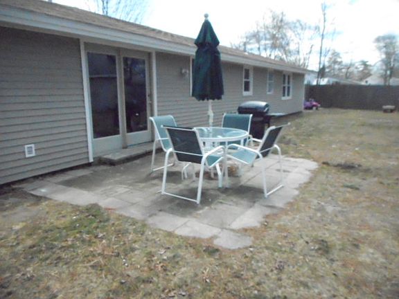 Lots of sun-drenched space for a young or growing family at an affordable price. Perfect for those seeking one level living also. Well maintained, nicely landscaped and in move-in condition. Vinyl siding, very large rooms, big fenced yard and a huge shed with electricity. Solid oak kitchen cabinets with a breakfast peninsula and a separate dining room with French doors to the patio. New carpeting, fresh paint, lighting fixtures and cabinet hardware. The bathroom/laundry also has a dressing or folding area (originally a closet from the bedroom on it's left). There are 2 very large bedrooms, either can be used as the master, and a nice separation between the two for an extended family scenario if needed. Town water and sewer and natural gas for heating and cooking are always a plus!