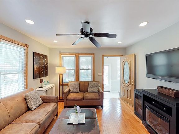 Lovely 2 story home with 4 beds and 2 full baths on a quiet street. Updated kitchen with stainless steel appliances. Updated bath, hardwood floors, tile, spiral staircase, full basement, radiant heat, enclosed porch, newer windows, 1 car detached garage with storage loft and large yard.