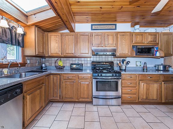RELIABLE RAISED RANCH! Surprisingly spacious w/nice sized rooms & considerable storage. Completely renovated in 2007 -immaculate & well maintained. Classic upgrades. Oak HW Floors throughout. Has the look and feel of a treasured lake cottage. Awesome brick wall & WB stove stands proudly in the oversized LR/DR area. Large picture window overlooks beautiful lake views. EiK boasts high ceilings, skylights & cedar shiplap. SS Appls. 2 BDRM & bath comp 1st level. Living space maximized downstairs in walkout bsmt w/FR, full bath, bdrm, mudroom & tons of storage in laundry. Enjoy private setting & nature on back patio or lake views from front deck! CA & Natural Gas. Paved driveway for 2. Perfect starter home, ready to be enjoyed NOW! All located w/in mins of ILCC beaches & activities + NYC Direct transport & Dwtn.
