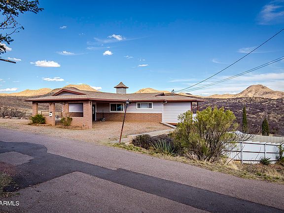 This two level hilltop view home is a rare find in Bisbee. Perched at the very end of Warren, and overlooking a scenic grazing area and mountains, this 1995 build takes full advantage of its scenic surroundings. Both stories have ground level entry, and two levels of wrap around porches. The unique floor plan can de divided into two fully equipped apartments, or left as a single family home. The upstairs is a 2 BR, 2 BA, and the downstairs portion has a large bedroom/multi purpose room, plus a kitchen, living room, and dining area. A spiral staircase connects the two areas, and this can be closed off with double doors for privacy- perfect for an on-site income unit or multi-generational living. No deferred maintenance, just move in and enjoy!