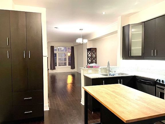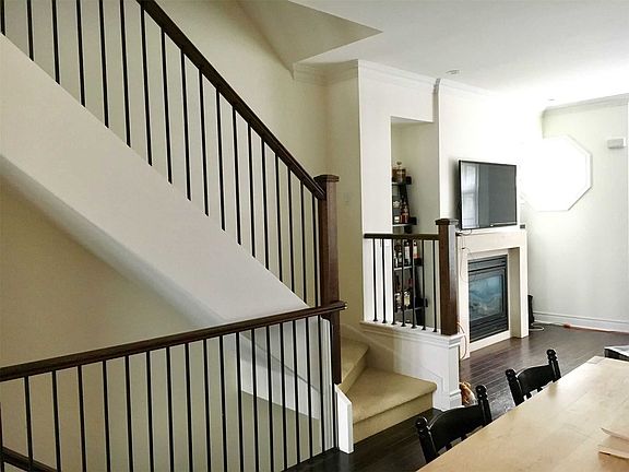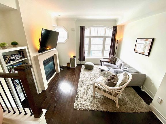 "Dupar Townhouse". Stunning And Contemporary. Approx 1950 Sqft Of Living Space. 3 Bdrms Plus A Den. 2.5 Baths. Open Concept Main Floor W/ Dark Hardwood Floor Throughout. W/O Deck, Gas Fireplace, Crown Moulding Throughout, Pot Lights. Huge Master With Privacy, Large His/Hers Closet; Spa Like 5 Pcs Ensuite, Jacuzzi Tub, Glass Show Enclosure W/ Bench. 2nd Floor Laundry, 2 Car Garage W/ Remotes. Right Off Qew, Mins To Hwy 427, Go, Ttc, Shopping And Lots More!