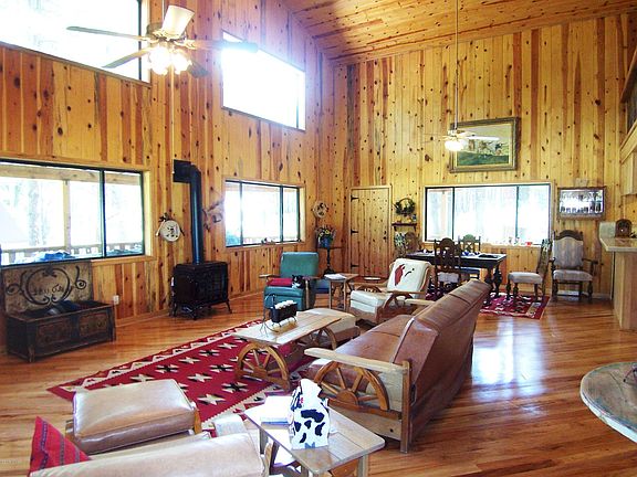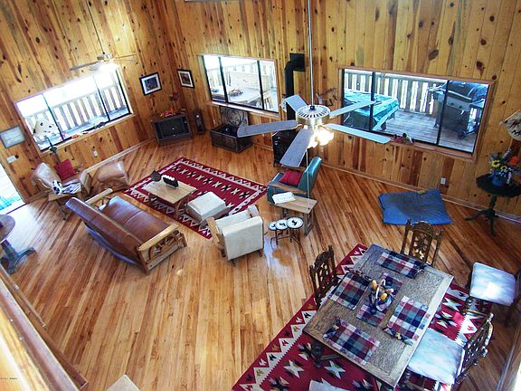 Waterfront property w/the ''Little San Francisco River'' running through it + small seasonable lake! Custom log sided hms w/detached guest house on 9 +/- acres. Homes feature Pecan Hickory floors, Vaulted wood beamed ceiling, tongue & Grove ''REAL wood'' walls & ceilings,both have ''sleep in'' lofts. Main hm 2/master suites,3 baths, + 20'x20' loft and 20' high ceilings, wrap around covered patios overlooking the river & lakes through tree's! Private guest hs w/kitchen, full bath, sleeping loft + Murphy bed. Amazing Views,Excellent produc well, Homes built for year long living. Energy efficient w/ETS heaters + gas quadrafire. Cross fenced w/3 rail pipe fencing, horses always have access to River. NO HOA NEW SS appliances. Virtual tours both cabins attached. Owner is Agent, may carry mort