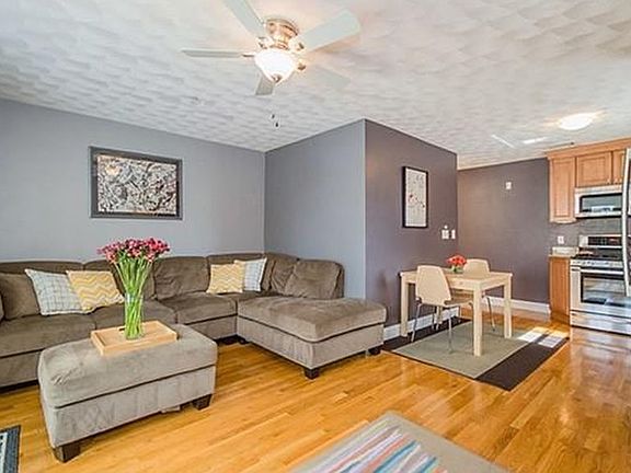 Unique duplex one bedroom condo in up and coming East Somerville. Located less than a mile from the fabulous Assembly Row as well as the Orange line T stations at Assembly and Sullivan Squares. Only half a mile to the much anticipated Gilman Square Green Line, and around the corner from amazing restaurants like La Brasa. New construction in 2010 and in pristine condition, this condo has it all. The open kitchen / dining / living on the first level with direct access to your spacious private deck is perfect for entertaining and al fresco dining! Upstairs the generously sized bedroom with walk-in closet, has room for a a king bed as well as a desk and dresser. Also located on the upper level is the modern bathroom with rain-shower and separate laundry closet with front load washer and dryer. Sparkling hardwood floors throughout, central AC, one off street parking space, and extra storage in basement. Pets allowed.