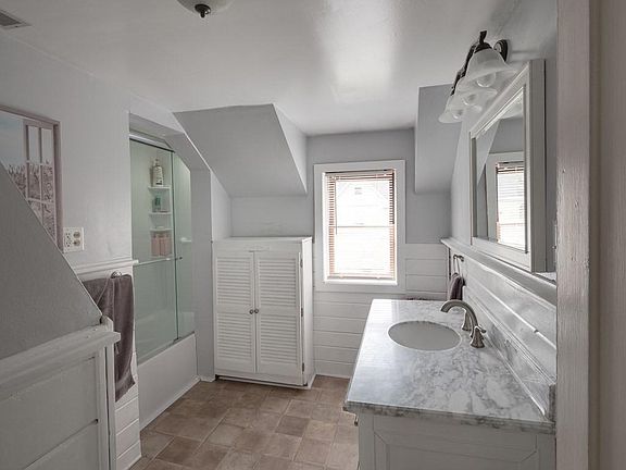 Storybook classic ! Old world charm in this super cozy updated home. Large eat in kitchen, 1st floor laundry & 1/2 bath, large dining room, living room with gas stove. Absolute show stopper in newly updated bathroom with marble top vanity, master has large walk-in closet. Deck to fully fenced yard with storage shed, central air. French doors off kitchen to enclosed porch room being used as hot tub/bar room. 1 car garage in rear of odd shaped lot needs some repairs. Convenient location to downtown Westfield or MA Pike. Stove, Fridge, Washer, Dryer all included, hot tub negotiable.