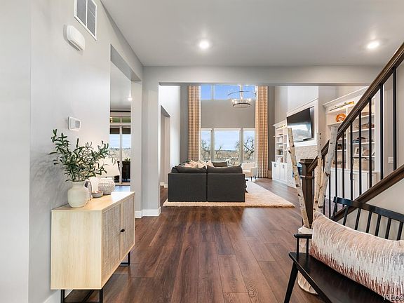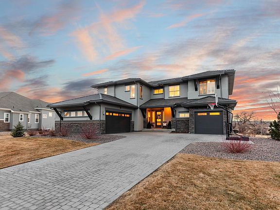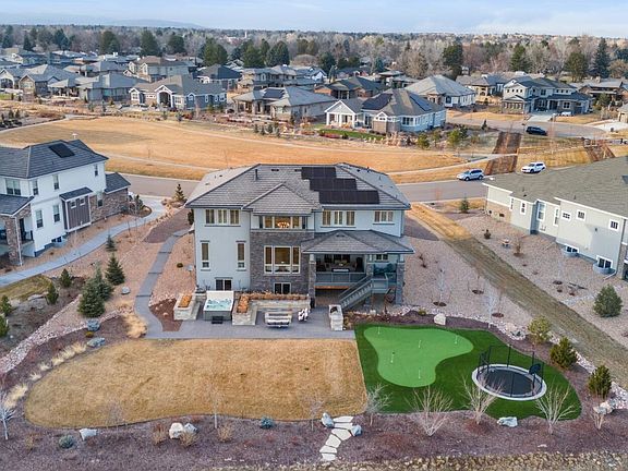 A remarkably timeless home located in Wild Plum, the highly sought after community in Columbine Valley. Set on a rare lot with lake and mountain views the fully landscaped lot feels like a resort with a large herringbone paver patio, stone planters framing a fire pit, built-in barbecue, putting green, hot tub, and an in-ground trampoline. The 2-story entry opens to the great room with unobstructed views. The formal dining room is perfectly located for hosting friends and family. A walk-through butler’s pantry offers seamless access to the kitchen. The gourmet kitchen showcases pendant lights, slab quartz counters, stainless appliances, gas cooktop and opens to a pocket-office. The kitchen overlooks a secondary dining space, which opens to the great room and the covered deck. The great room features two-story windows and stunning window treatments, a chandelier and custom built-ins framing the fireplace. A versatile bedroom with an ensuite bath serves as a home office or a bedroom. Upstairs, the primary bedroom captures panoramic views of the lake and mountains. The spa-inspired primary bath features dual vanities, ample counter space, timeless cabinetry, a glass-enclosed shower, and a freestanding tub. The upper-level laundry room has walk-through access to the master closet with ample cabinetry and a linen closet. Three generously sized secondary bedrooms complete the upper level, each with their own walk-in closet and ensuite bath. The lower level presents a blank canvas with endless potential for expansion. Residents of Wild Plum enjoy golf cart access to Columbine Country Club, offering social and golf memberships. Club Members enjoy a variety of amenities, including swimming, tennis, pickleball, golf, children's camps, senior events, dining options, and more. Only minutes to C470, and steps from top recreational spots like the Mary Carter Trail, Lake Chatfield, and Jeff Open Space, 26 Damsire Drive offers ideal balance of resort living and everyday convenience.