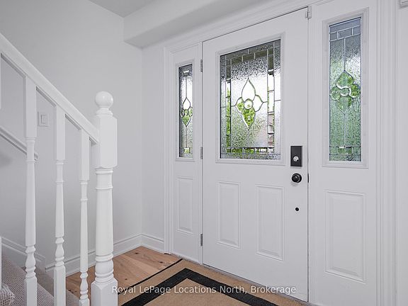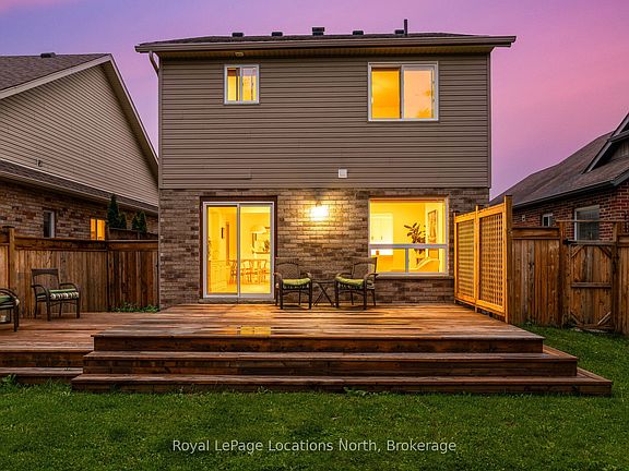 Discover this stunning 2,200 sq ft home nestled in the highly sought-after Creekside neighbourhood. Expertly renovated by Collingwood's acclaimed Kofoed Built, this elegant 3-bedroom, 3.5-bathroom residence offers an optional fourth bedroom in the finished basement, showcasing premium finishes that create a bright, open, and inviting atmosphere throughout. Step into the spacious, open-concept main floor where modern family living comes to life. The gourmet kitchen is a chefs dream, featuring high-end appliances, sleek white quartz countertops, and a large island perfect for gatherings. Relax in the living room adorned with a contemporary Napoleon fireplace, pristine white oak hardwood floors, recessed lighting, and an airy layout that seamlessly connects every space. Host unforgettable dinners in the dining area, bathed in natural light from a charming bay window. Sliding doors lead to a private backyard oasis with a newly built two-tier deck, and mature trees. Enjoy breathtaking west-facing sunset views from the serene back deck an entertainers paradise. Upstairs, the primary suite offers a tranquil retreat complete with a stylish ensuite and a spacious walk-in closet. Two additional bedrooms maintain the homes modern aesthetic, while a versatile landing space serves perfectly as a chic home office. The fully finished basement expands your living options, featuring a cozy family room, office nook/playroom, an extra bedroom, and a full bathroom. Ample storage solutions, including cold storage, ensure every need is met. Situated on the quiet, non-sidewalk side of the street and adjacent to Collingwood's scenic trail system and Black Ash Creek, this location perfectly balances peaceful nature with easy access to downtown Collingwood. Experience the perfect blend of contemporary elegance and everyday convenience in this exceptional Creekside home.