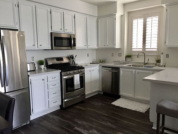 Completely remodeled! Stunning Brand New Wood Flooring, Custom Quartz Counter Tops with Bar, Fresh Carpet & Paint Throughout, Entirely Equipped with LED Lighting & All New Kennmore Stainless Appliances! Master suite with walk in closet and dual vanity. 2nd bedroom contains private bath & closet along with windows viewing Founders Park. 2 Car Garage with direct access to trash and mail. Association contains a gated private pool and spa within walking distance song with full access to Ladera's amenities & 12+ pools!