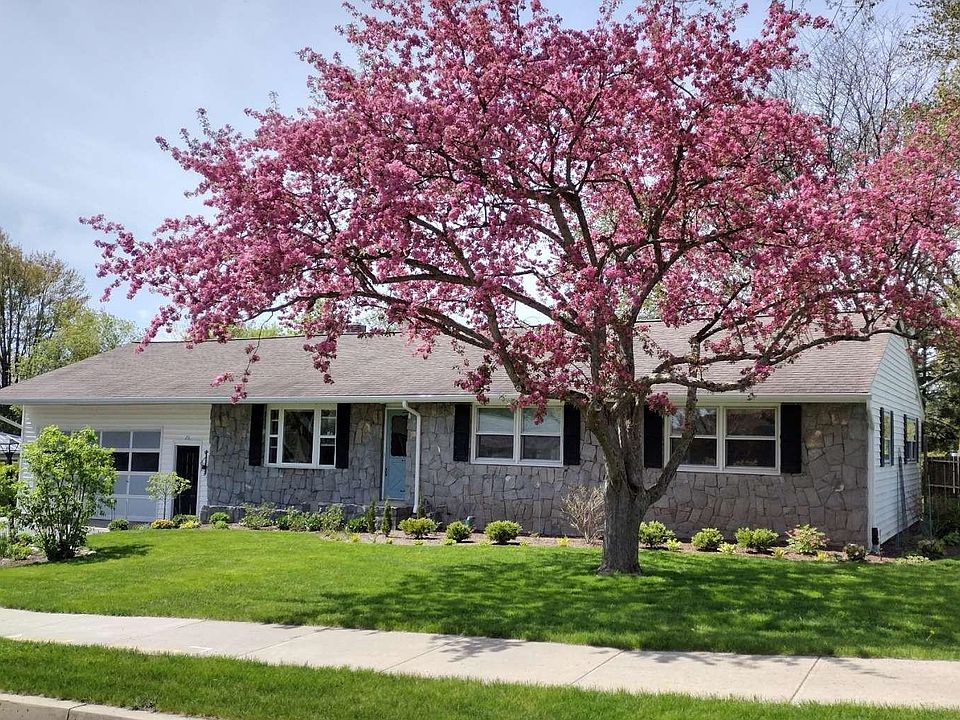 Arrange your first or follow-up walk-through of this 1970 ranch, expanded with 1977 addition. Highest and best offers due by Thu May 18 at 7pm. Nicely situated on a tree-lined street with village services including bus, Amtrak, schools, stores, & eateries all within a short mile walk/bike. Perimeter hedges afford privacy for this 0.32 acre lot. Landscaping professionally designed and multiple raised-bed gardens. Striking stone-faced front with low maintenance vinyl siding on other exterior faces. Wheelchair accessible (not ADA) from garage and front entrance. Oak hardwood floors predominate in the 2015 sq ft one-level space. Newly remodeled (2019) rec-room/den/tiled walk-in shower/bath area has potential as in-law space with separate entry. Owned 3.9 kW solar array (2017) helps keep power expenses low! Large 1440 sq ft basement (poured 8” walls), also accessible from the 2-car garage, includes 584 sq. ft finished space, a 3/4 bath, and storage bays. New (2021) direct-vent gas boiler and HW tank. Sewer & storm water systems recently replaced. Notable are the eat-in kitchen peninsula, stainless-steel appliances, central vac, many solid-core interior doors, oak wainscot, mudroom, patios, shed, hearth & chimney. Selling as is. Ceiling track rails, wall cabinets in bedroom, and counter cabinets in rec-room will be removed. Targeting a July 10th closing. Open house Wed May 17th, 6 to 8 pm. Enjoy this home & setting current owners have relished for 29 years!
