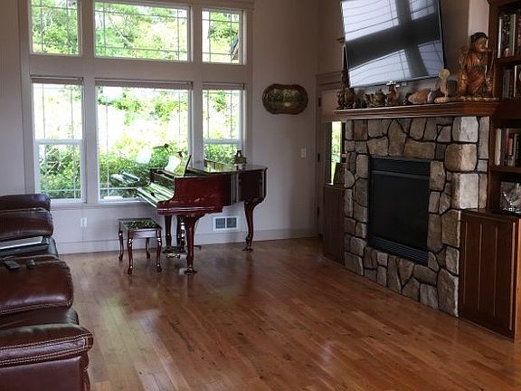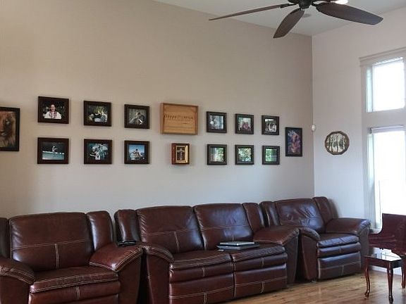 50' RV barn w/full hookup plus extra lg 2 car garage. Granite counters & island, tile backsplash. Kitchen has LED lighting. Tandem Stone fireplace in great room & den/bdrm. Marble countertops in the master & guest bathrms. Cedar closet in master bedrm. Hardwood floors. Soaring ceilings. Lg custom windows. 2nd bdrm/den has French doors & a full closet. Bdrm/den has a slider out back covered patio. Add LOT for extra price .