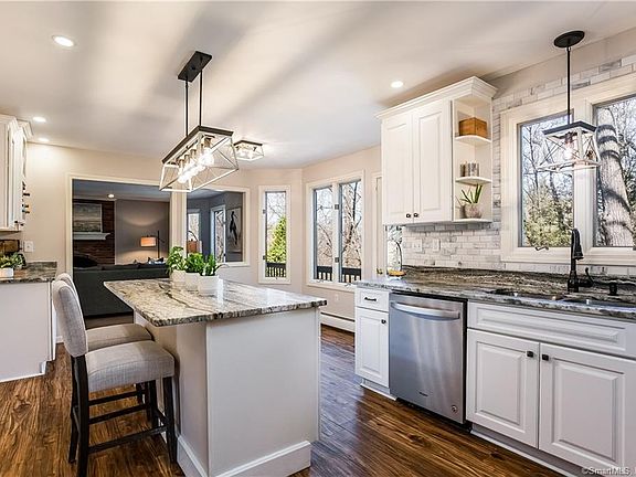 Warm, inviting colonial perched on a quiet cul-de-sac showcases nicely maintained & updated interiors. Stroll up & relax on welcoming front porch. Entry offers views of first floor w/its nice circular flow. Open renovated kitchen/great room highlights freshly painted walls, new light fixtures, white wood cabinetry, granite tops, center island, luxury vinyl plank flooring, stainless appliances, wine/coffee bar opening to great room w/wood burning fireplace & sliding barn doors separating front living room. Dining room/home office has hardwood floors, crown molding & Arts-n-Crafts style French doors for nice privacy if needed. Convenient mudroom area w/built in storage bench & wall hooks & laundry closet w/shelving handles lifes daily routine. Nice outdoor living space with wood deck & bluestone paver patio overlooking wooded lot. 2nd floor boasts generous primary suite w/tray ceiling, two walk-in closets & nicely renovated bath w/tiled shower, double vanity & skylight, 3 bedrooms plus full bath w/fiberglass tub/shower. Walk out lower-level features nicely finished spaces w/carpeting, wet bar area with maple cabinetry, stone fireplace with flue for future wood/pellet stove & bath.