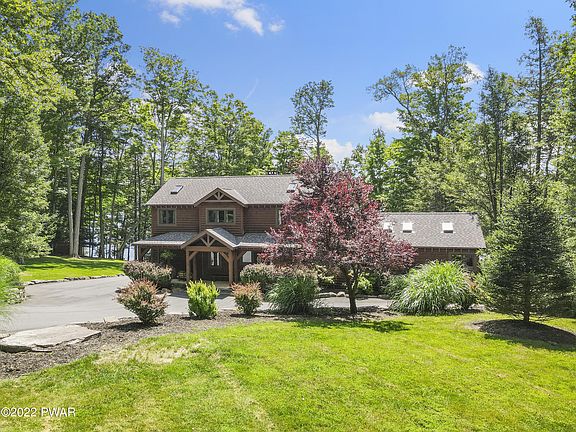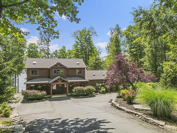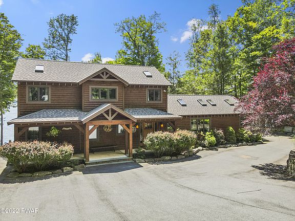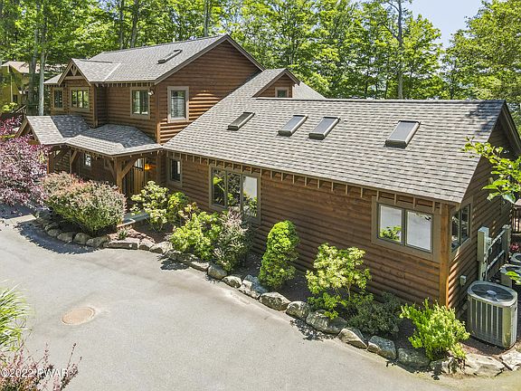 ''Walden Lodge'' - This exclusive Lake Wallenpaupack lakefront 5,200 SF LOG home features 5 bedrooms, 3.5 Baths & 325' of frontage on 1.5 acres! Amazing location w/a private boat ramp & dock. Enter through the grand foyer w/original wide plank oak pegged floors, a great room w/original stone fireplace & oak beams. Master on 1st w/ensuite bath, marble floors/counters & jacuzzi tub. Custom kitchen w/a Viking stove, Subzero refrigerator/freezer, custom cherry cabinets, granite counters & slate floors. 2nd floor loft, office & 2 additional bedrooms & bath w/dual vanities. Lower-level bedroom, full bath, laundry, home gym, sauna, 2nd kitchen & recreation room w/a custom bar. Two-car oversized garage w/workshop & an insulated & heated unfinished bonus room. Blue stone patio, firepit & walkway., Beds Description: Primary1st, Beds Description: 2+BED 2nd, Beds Description: 1BedLL, Baths: 1 Bath Level 1, Baths: 1 Bath Level 2, Baths: 1 Bath Level L, Baths: 1/2 Bath Lev 1, Eating Area: Dining Area, Eating Area: Modern KT, Beds Description: 1Bed1st