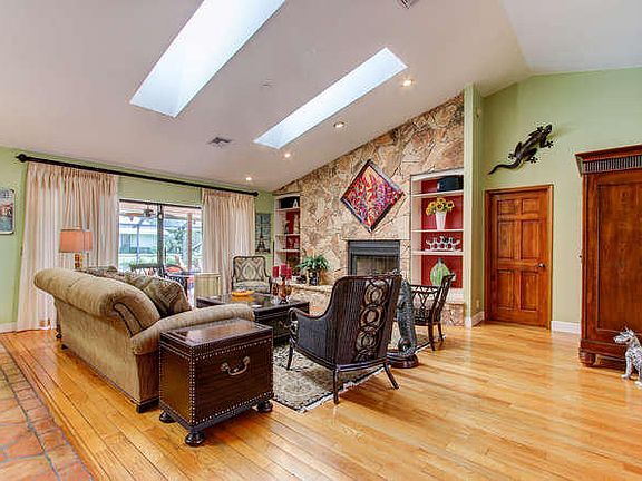 Outright remodel with grand sophistication, this gorgeous three bedroom home plus den sits on a peaceful lake and fountain lot with a true backyard. The eat-in kitchen reveals fabulous views of the pebble tech screened in pool & comprises of custom cabinetry, granite counter tops with a Q-seal tumbled marble backsplash. The kitchen is equipped with a Miele integrated dishwasher & Dacor refrigerator & microwave, Viking Stove, pull out spice racks and computer drawers. The living room opens up to the kitchen's bar for seamless entertainment with a custom designed stone wood burning fireplace. The Master suite is unified with porcelain tile flooring, plantation shutters & a totally remodeled master bathroom. Other features of the gorgeous household includes a Gerard metal roof & 3-car garage!