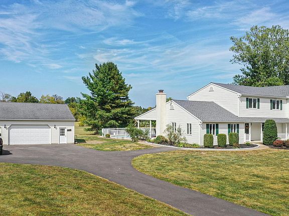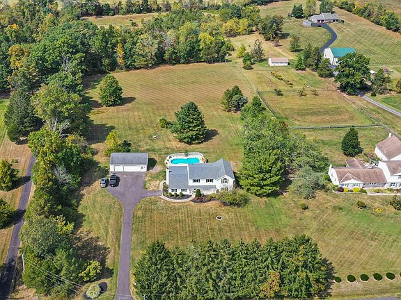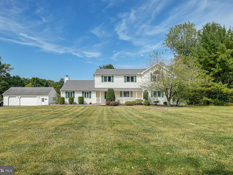 Home Sweet Home – look no further! Nestled among lush Bucks County farmland in Tinicum township, 26 Gruver Road boasts 2 acres on a deep lot with mature trees to create privacy, yet this country location is just minutes from Plumsteadville and less than 20 minutes to Doylestown. This 5 bedroom, 4.5 bath home has many special features, including options for multi-generational living. The covered front porch provides a welcoming entrance as you enter the home, to the right is the living room with decorative bay window. Down the hall to the left is the fabulous and spacious family room with all the space to entertain in style and comfort, from the inviting stone-accented, wood-burning fireplace, vaulted ceiling and French doors to the deck, you will love relaxing or watching the big game in this room. The remodeled kitchen has gorgeous, rich wood cabinets, stainless steel appliances, granite countertops, tile backsplash, and a large prep island. The kitchen flows into the adjoining dining area which has sliding doors out to the deck. The bonus on the main level is the in-law/guest suite, complete with bedroom, living room, full bathroom, full kitchen, two walk-in closets and its own separate entrance, this could easily become the primary bedroom suite. The first floor is complemented with a powder room and laundry room. Upstairs, you will find a luxurious primary bedroom suite with vaulted ceiling, two walk-in closets and a balcony for enjoying the views of the farmland with your morning coffee or book. The en suite bathroom features a stunning arched window to let the light in, a tile walk-in shower, soaking tub, dual sinks, and vanity. The generously sized third bedroom also boasts an en suite bathroom, and the two additional bedrooms share the newly remodeled hall bath. Of course, we can’t forget the expansive, composite deck off the family room, which features a covered section and an open area to enjoy the sun while you are just steps away from the sparkling in-ground pool! This home features neutral colors throughout, new hardwood floors on the entire second level, new flooring on the main level, updated bathrooms, and new roof, gutters, and downspouts (11/23), with nearly 3,000 sf of living space – making it move-in ready! The partially finished lower level with outside entrance allows room for a home gym, office, or additional entertainment space. The oversized 3 car detached garage has plenty of room for pool and lawn equipment. Highly rated Palisades school district and low taxes make this an obvious choice. Close to Stover’s Mill, Ralph Stover State Park, Ringing Rocks, and the Tinicum Park Polo Club, and just a short drive to the charming Delaware river towns of Point Pleasant and Frenchtown, means you are sure to find plenty of activities to enjoy! You will want to make this home yours! Schedule an appointment today!