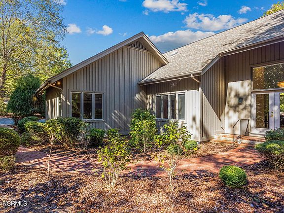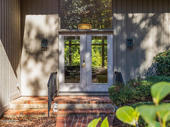 Nestled amidst the tranquil pines of Pinewild Country Club, this exquisite residence seamlessly harmonizes with the lush woodland backdrop, boasting sunlit windows that effortlessly beckon your gaze towards the picturesque expanse of the adjoining golf course, serene ponds, and majestic trees. A single-level haven characterized by its uncluttered design, soaring ceilings, delicate pale wood accents, and a soothing palette of soft white hues, this home resonates with the peaceful essence reminiscent of Scandinavian interiors, instilling a sense of serenity and tranquility in every nook and cranny. The dual-level deck offers an idyllic setting to relish the outdoors, whether it's hosting gatherings, savoring meals al fresco, or simply basking in the gentle embrace of the sun as it filters through the verdant canopy above.