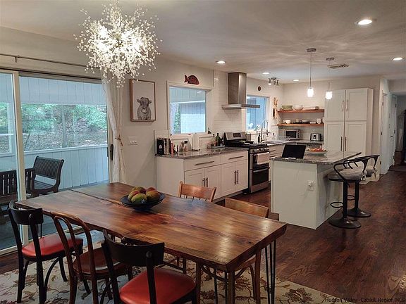Beautifully renovated move in ready home only 3 minutes from the center of Woodstock. This home was renovated with a modern minimalist aesthetic creating an open light and relaxed feel. The open floor plan invites you to enjoy the coolness of central air in the summer and the comfort of a wood burning stove in the winter. The spacious kitchen with its beautiful white cabinets and granite counters has a large island so your guests can gather while you cook and enjoy all your brand new stainless steel appliances. Off the kitchen is the dining room and a large screened porch which can become a four season room or be opened up to create a deck overlooking the back yard which has ample space for an in ground pool. The main level also has a family/music room with a beautiful brick fireplace. Upstairs you will find three nice size bedrooms, a renovated bathroom and a hall laundry area with front loading washer and dryer. The gorgeous master bedroom with fabulous cathedral ceiling was completely reconfigured to add a luxurious master bathroom with separate shower and soaking tub as well as a large walk-in closet. The property is located in the area's most lovely neighborhood with a one mile walking loop just at the end of the driveway and the new Ashokan Rail Trail only a few minutes drive away. Owner is open to selling the home furnished for an additional cost.