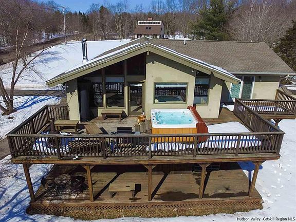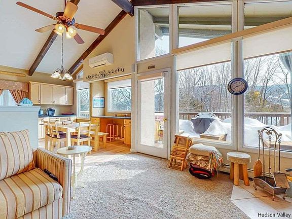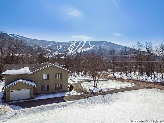 Reduced price! Alpine Chalet in the heart of Windham Village. This exceptional home is not only beautiful, but the location is considered one of the area's best hidden secrets, Indian Heights Rd- a quiet no outlet residential neighborhood, with million dollar views of Windham Mt ski slopes, and is walking distance to Main street- offers the best of both worlds. Sun drenched open concept kitchen- living room features vaulted ceiling with exposed beams, woodstove, and a wall of glass framing views of Windham's trails. Luxurious Master suite, ductless split a/c units, new carpets, painting, and full-size garage are recent upgrades. Large entry foyer provides a warm welcome with room to organize your gear. Lower level has cozy family room, two nice size bedrooms, full tiled bath, laundry room w access to garage. Expanded deck with hot tub is the perfect spot to relax after a day's outdoor adventure. Soak up the good life here (All real estate professionals and members of the public are required to wear a mask when visiting this property.)