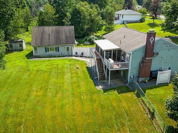 Showings Begin @ Open House Aug 4, 12-2! Welcome home! 3 bed, 2 bath home on a cul-de-sac sitting on almost an acre abutting DCR land. Living room has HW floors with French bi-fold doors open to the eat in kitchen with bay window, s/s appliances and an island with a door to 3 season porch where you can enjoy your morning cup of coffee overlooking your private backyard with exterior access. Master suite featuring HW floors, large closet & private master bath with linen closet. Another full bath and 2 additional generous sized bedrooms w/ ample closet space & HW floors conclude the main level. Basement is partially finished with a fireplace and plenty of storage room with tons of potential to be fully finished to offer more living space for family and guests. Entertain in your large, fenced in backyard w/ fire pit, deck and 2 storage sheds.Wired for security cameras & recent boiler. 4 car detached garage with finished 2nd floor has many possible uses. Also a 2 car under. See it today!