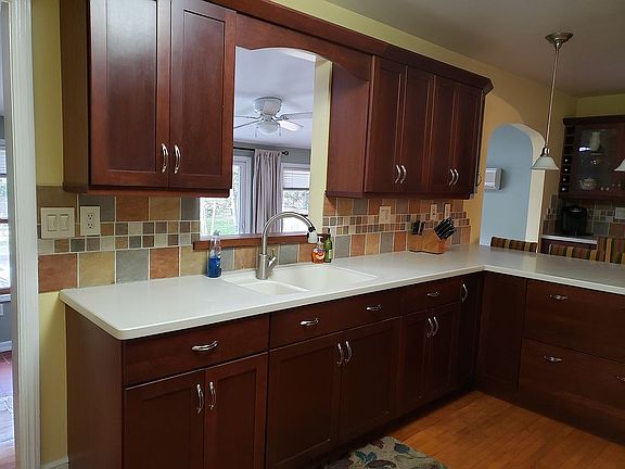Super cute Cape Cod Style house in Red Hook Village. Walk to town, the community pool and Bard bus. Large tree-lined lot with a private backyard. Sliding doors lead to a beautiful bluestone patio for the perfect outdoor oasis. Great to enjoy morning coffee or dinner. A great fenced-in garden area, perfect for a gardener! Modern updated kitchen, hardwood floors throughout even under the carpeted living room. Two rooms on 2nd-floor for guest or office space, with half bath for use. Updated roof, electric and hot water heater. The first-floor master and second bedroom have lots of light and are so cozy. Full bath has a deep, spa-like whirlpool tub and a separate shower. Minutes to Amtrak & TSP. Huge basement with lots of potential for gym, workshop or play area. A terrific house!