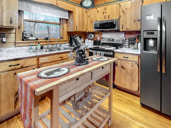 Cherry Log Charmer-2BDRM/1 BA cabin plus mini loft that is perfect for a bunk area, office or nook. This fully furnished cabin embraces the open living concept &,just feels like home when you step into the great room w/its vaulted ceilings, exposed beams, hard wood floors & wood burning fireplace.The adjacent kitchen is sure to impress w/updated appliances & ample cabinet space & we can't leave out the dining area bump out w/its wall of windows to enjoy the beauty around you. In the spirit of embracing outdoor entertaining at its best, the large upper deck & screened porch at main entrance make access to the terrace level a breeze. Lower level boasts a large deck w/ "like-new" hot tub, Kenmore gas grill & a large crawl space that is perfect for storing your kayaks & other toys. If that isn't enough outdoor for you, you will love the easy access from this level to the backyard w/fenced in area, grill, & fire pit. Located on easy to travel roads in a scenic, rustic community w/ trails, community lakes & more, you can enjoy the quiet while being only minutes away from all that Downtown Blue Ridge & Ellijay have to offer. Immaculate upkeep (brand new roof, newer appliances/countertops/stain & much more) truly make this well loved & maintained cabin a must see!