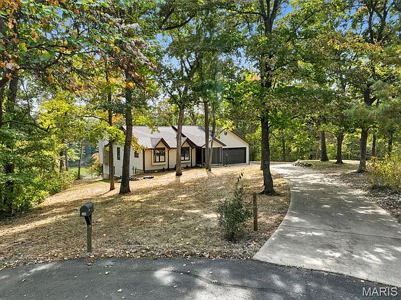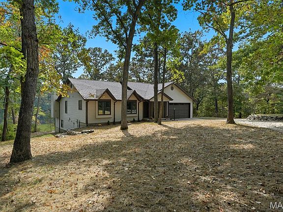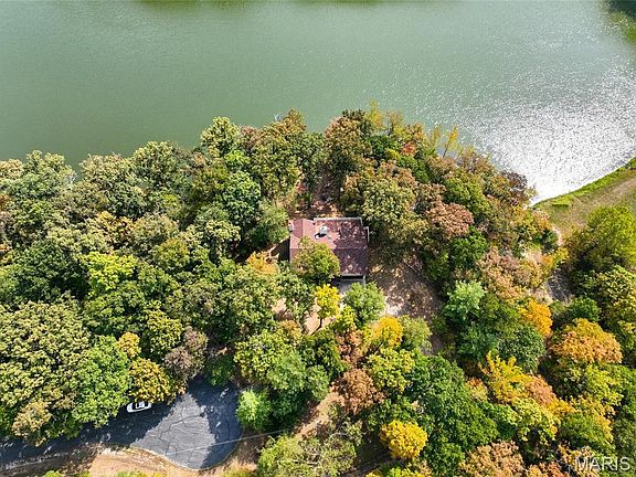 Wonderful Waterfront Ranch On Large 14 Acre Lake With Nearly 1000 Feet of Waterfront Frontage On Over 10 Plus Wooded Acres! This fantastic home has been updated, remodeled from top to bottom! From the foyer thru out main living area gorgeous hand scraped Hickory wood flooring in vaulted great room w/ wood burning stone fireplace & skylights! Great room opens to breakfast room & lovely kitchen w/ upgraded cabinets, stainless appliances, tile flooring & quartz counters! Off the breakfast room a 17x 9 sunroom was added w/ tongue & groove vaulted wood ceiling for a great view of your private wooded yard & lake! This split bedroom floorplan has large master bedroom with 2nd fireplace and private luxury bath with tile flooring, whirlpool tub double sinks & separate shower! Two nice size bedrooms & 2nd remodeled bath completes the main level! Walkout lower level has a 4th bedroom, full bath & laundry room plus lots of unfinished area to complete to your liking! Incredible deck off the sunroom is great for get togethers at the lake!! Other upgrades, new roof in 2023, new deck in 2006, concrete driveway & siding in 2006. In 2021, mold was found in basement and entire house was gutted to studs both downstairs & upstairs, whole house including insulation, walls, wiring & plumbing replaced with new. Subfloor in kitchen was taken out & replaced. Fabulous home at the end of cul de sac with large waterfall & creek along with lake & enjoy St Charles County's Indian Camp Creek in walking distance!