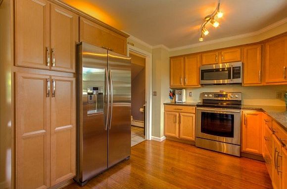 Move right in to this beautifully updated 2 bedroom 2 bath home on lovely landscaped lot. Kitchen has been renovated with new cabinets, stainless appliances, quartz countertops and farmers sink. Bamboo flooring on first floor with new lighting and plumbing fixtures throughout. This condex has NO CONDO FEES and the land is not shared. Full dry basement for storage or finish it off for more living space.