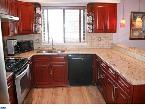 Spacious 3BR 2.5 bath end unit on a cul-de-sac location. Walkway to gate entrance and fenced rear/side yard. Center hall foyer with closet and powder room, formal living room with vaulted ceiling and dining room with new flooring. New kitchen w/ granite counters, cherry cabinets, recessed lighting. (Kitchen Aid gas stove, Bosch Dishwasher, GE profile refrigerator)Adjoining FR features a custom gas fireplace and built in shelving for your entertainment systems.Security system, central air and new flooring. Pride of ownership shows in this beautiful home! Convenient to I-95, Rt 29 and central to Phila & NYC. Flood insurance needed.