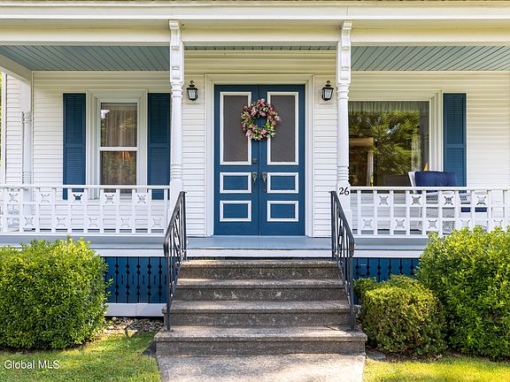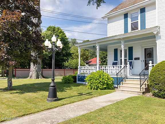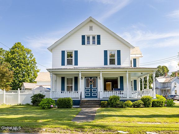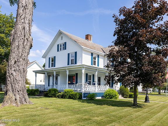 This beautiful spacious home has been meticulously well-cared for. Original details preserved, updates to kitchen/baths, replacement windows, hardwood floors, central air, neutral color painted inside, porches/shutters freshly painted are only some of the desirable traits. The1st floor bed/bath/laundry are convenient & 4 other bedrooms upstairs plus a flex room, another full bath & a half, a walk-up attic; great for storage or a bonus room & give this home a spacious feel. The dry basement has tons of storage, a workshop & workout area. The 2 story barn garage is awesome & has a huge attic where a remodel could be done w a private entrance. Perennials make this lovely home w wrap around porch & pool area an oasis to relax & unwind. Quaint small town & nice neighbors-This is your new home!