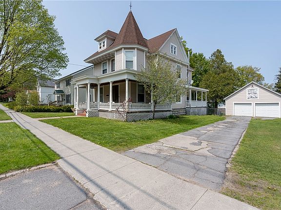 Welcome home to this Spacious 4 Bedroom / 2 Bath Victorian Home with detached 2 stall garage and fenced in back yard. Fall in love with the front wrap around porch and original double doors on the front of the home. First floor consists of an amazing entrance parlor with the original hardwood stair case, an office/den area, living room, dining room, kitchen and full bath. Second story has a master bedroom, 3 additional bedrooms, and a full bath with an original claw foot tub. There are stairs that lead to the partially finished 3rd story of the home. The back door leads to a covered back porch and the fenced in yard. The garage has walk up stairs for additional storage. With Natural Gas Heat, Public Water and Sewer, this house is great on utilities. A short drive to Ft. Drum and Watertown gives this village home the best of all worlds. Call today for your private showing.