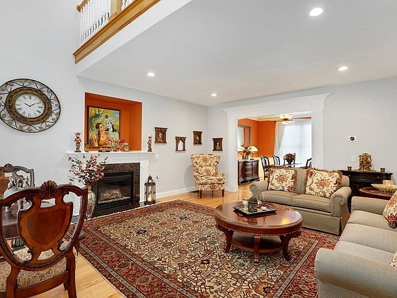 Beautiful Northeast facing Colonial residence in desirable Peppercorn Village over 2,350 sqft. of living, 3 beds/2.5 baths, and 2 car garage- all situated on almost 1/2 acre of lush grounds. The covered front porch welcomes you to a beautiful living room, with granite surround gas fireplace, beautiful moldings, and hardwood floors. The formal dining room features columns and wainscoting flowing into the beautiful, generously sized eat-in-kitchen with cherry cabinetry, granite countertops, stainless steel appliances, large island, and built in china cabinet. Second floor, drenched in natural light, a lofted family room/home theater, primary bedroom with vaulted ceilings, dual closets, cherry bathroom with double vanity, 2 additional generously sized bedrooms, and second floor laundry. Lush backyard is ideal for entertaining or neighborhood get-togethers! Huge open basement with lots windows of can be finished for added space. Easy access to top-rated schools, highways, shopping