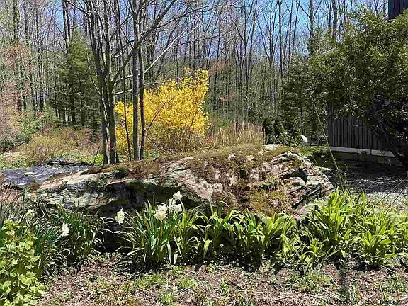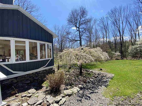Sun drenched contemporary home, nestled on SIX PLUS private acres. Perfect combination of woods, meadow AND a Mountain View too! This four bedroom, two and half bath features wood floors, skylights, walk in cedar closet and laundry room. Extremely efficient, double insulation makes heating and cooling this home a breeze. Large kitchen has loads of cabinets, granite countertops and stainless appliances. Love to entertain? The open floor plan leads to patio, bringing the outdoors in. Your own peaceful sanctuary is landscaped with stone paths, mature plantings, two organic gardens area and a small koi pond. First time ever on the market. Original owners have made lasting memories here. Its your turn!