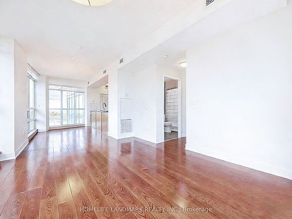 Welcome to Bravo Boutique Condos! This beautifully designed 1 Bedroom + Den corner unit offers approximately 800 sq ft of bright, functional living space. Enjoy soaring 9' ceilings, wraparound windows, and panoramic north, south, and west views that flood the unit with natural light. Featuring hardwood floors throughout and a modern open-concept kitchen, this home is perfect for comfortable living and entertaining. Ideally located close to schools, subway transit, shopping, and amenities-urban convenience at its best.