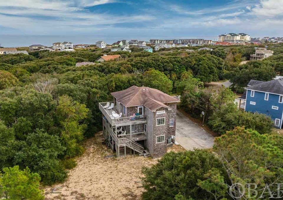 Secluded in the maritime forest of the much sought-after Southern Shores community, this traditional 4-bedroom, 2 1/2-bath home with its cedar shake exterior is reminiscent of the old Nags Head charm. Inside, the tradition continues with its coastal nautical theme that is a perfect backdrop for family get-togethers and your home away from home. All the bedrooms are conveniently located on the first level (the master with its own private bath and then a hall bath with jacuzzi) and the second level is open-concept living infused with sunlight and the sound of waves crashing on the nearby shore. Enjoy your morning coffee or read a book in the welcoming sunroom, plan an outdoor barbecue, spend sandy days at the beach (two accesses are within walking distance) or treat yourself to the best of Outer Banks shopping and dining. You'll be close by to everything the beach has to offer. Come take a look!
