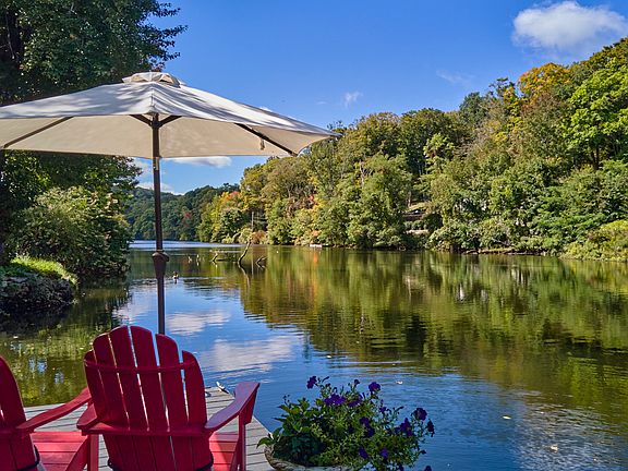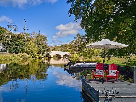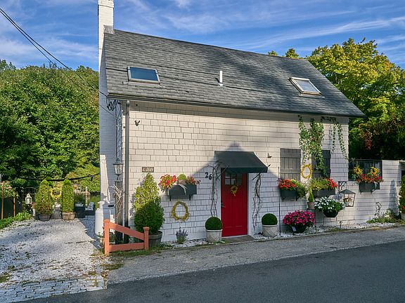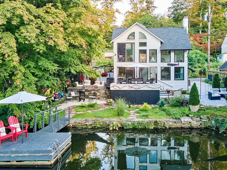 From the street, one sees a c.1859 period antique cottage with its shingled facade and its signature red door, a nod towards Lyme's heritage. It was built when Joseph Trumbull was elected CT governor, which was amid the CA gold rush. Yet like a magician on stage revealing his feat, the water's side is an architect's vision that transforms the home into a light-filled, modern retreat where history and design meet in perfect balance. The rear elevation soars with glass and angles, framing Hamburg Cove as if it were a living painting. Inside, the design tells its own story. Vaulted ceilings flood the living areas with natural light. Custom cabinetry mirrors the motif of panes and squares that repeat throughout, blending architecture and craftsmanship in subtle, intentional ways. The kitchen is both efficient and stylish, featuring butcher block counters, innovative storage solutions, and contemporary fixtures. Living and dining spaces open to the outdoors, creating a seamless connection to patios, gardens, and the water beyond. Upstairs, every room is oriented to maximize views and comfort, proving that compact square footage can still live large when the design is right. Step outside, and the lifestyle becomes the headline! Landscaped terraces, stone walls, and multiple seating nooks invite relaxation and entertaining. A private dock brings Hamburg Cove to your doorstep! Known among sailors as one of New England's premier "hurricane holes," Hamburg Cove offers sheltered waters, natural beauty, and direct access to open water.. It's a setting that combines security for boaters with serenity for those who simply love the water. The home is situated where the Eight Mile River meets the beginning of the Cove, just north of the marina. Beyond the cove, the advantages of the Lower Connecticut River Valley complete the package. Gillette Castle offers hikes and sweeping views, while Selden Neck State Park provides boat-in trails and wilderness camping. Essex Village and its steam train deliver New England charm. Old Lyme anchors the region's art colony, featuring the Florence Griswold Museum. It's more than a residence - it's a carefully balanced performance of antique authenticity, architectural creativity, and waterfront living. A rare opportunity for buyers who appreciate history but expect design, lifestyle, and location to work in harmony.