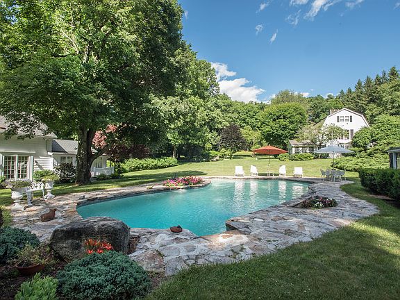 "Twin Willows", a fine Ridgefield residential property, is surrounded by tranquil, rolling lawns and gardens. The 300 ft driveway is flanked by stone walls and shade trees on either side and affords privacy. Formerly part of the Scripps Estate, the main residence boasts walls & ceilings of thick solid concrete construction. The generously appointed living room includes a Belgium brick floor-to-ceiling fireplace, 30 x 35 foot family room with vaulted ceiling rising 18 feet. The bright and sunny master bedroom suite, a privately situated wing, stretches the full width of the rear of the building, and includes a dressing room, built-ins and plentiful closets. In the northwestern corner of the building is a spacious, airy solarium, surrounded on three sides by windows and exits to the beautiful lawn and gardens in the rear of the house. Amidst the idyllic setting of lavish plantings, specimen trees and lush lawns sits a beautiful custom-designed, free form heated Sylvan pool. A wide apron of hand-selected stone surrounds the pool and makes an excellent area for outdoor entertainment. A second building consisting of 5 rooms with 1,800 sq. ft. 2 full baths, a kitchenette, a magnificent 22 x 40 foot great room with 16 foot ceiling and French doors, attic and basement is centrally air conditioned. Two outbuildings sit behind the studio. Twin Willows, designed by an internationally-known photographer and designer is a truly exceptional home and property. http://26oss.cntlistings.com