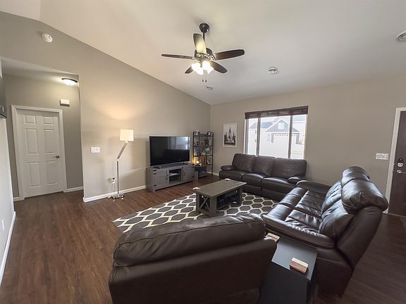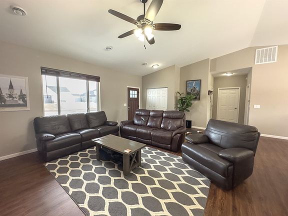 Check out this 1 level, 1 owner home!! 3 bedrooms, 2 full baths, 2 car attached garage. The vaulted ceilings in the living room make this space feel even larger with the open concept living, dining and kitchen area. The kitchen has a custom feel with the under-cabinet lighting, upgraded Samsung appliances, quartz counter tops, soft close doors and drawers, crown molding, built in wine rack, pantry and a sliding glass door leading out to the fenced in back yard complete with a double patio and gazebo, sprinkler/drip system and fence. An additional parking pad is pored next to the garage.   The primary bedroom is nice sized with recessed lighting, a bump out window, oversized bathroom with double sinks and a walk-in closet. The additional 2 bedrooms conveniently have a full bath and linen closet between them on the other side of the home. The other nice feature in this home is the in floor heat that continues into the garage, along with a furnace and central air. This keeps the home at a continuous temperature in the winter. The on-demand water heater is also a bonus.