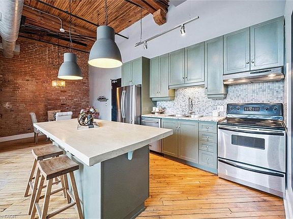 Discover rare industrial-loft living at 122-26 Ontario St, nestled in the luxurious Mill Lofts-formerly the historic Guelph Worsted & Spinning Company, circa 1902 & thoughtfully converted into boutique condos in 2004. This tastefully updated 2-bdrm loft offers the best of both worlds: modern luxury finishes paired W/preserved historic charm all nestled in the heart of downtown Guelph just steps from vibrant shops & cafés. Step inside & be captivated by dramatic 13ft ceilings showcasing exposed old-world wooden beams & original brick walls found in nearly every room. Oversized windows bathe the open-concept living & kitchen space in natural light, highlighting the rich hardwood floors & enhancing the warm, welcoming ambience. Sleek & sophisticated kitchen W/quartz counters, backsplash, S/S appliances & centre island W/pendant lighting-perfect for casual dining & entertaining. The adjacent dining space, graced with its own brick feature wall & designer lighting, rounds out the sociable layout. Both bdrms feature hardwood, massive windows, exposed brick & lots of closet space. Completing this home is renovated 4pcbath W/quartz counters & subway-tiled shower/tub. With only 78 units in this boutique heritage building, opportunities like this don't come up often! Unit includes in-suite laundry, 1 parking spot, locker & access to large detached party room-perfect for hosting friends & family. Main floor living means you get all the benefits of maintenance-free condo life without the hassle of stairs or waiting on elevators. Embrace the best of downtown with a highly walkable lifestyle, just steps to cafés, boutiques, dining hotspots, nightlife & GO Station. Just a few doors down from Standing Room Only, Canadas smallest bar & beloved local gem. For nature lovers, York Rd Park is right around the corner with picnic areas & sports fields, while the scenic Eramosa River Trail winds peacefully along the water-perfect for walking, running or cycling right from your doorstep.