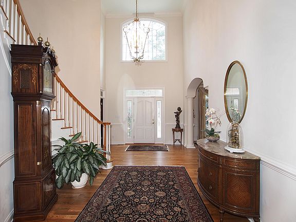 This gorgeous, custom built brick home is located in Pinewild Country Club at the end of a small cul-de-sac overlooking water and golf, one of the most scenic lots in the neighborhood! The curb appeal of this very special home is outstanding with mature landscaping, screening trees that increase the privacy of the back yard, water feature and lots and lots of spacious patio area with wrought iron railing surround , a wonderful place to enjoy the incredible views! Entering the impressive two story foyer with triple crown molding, your first view is of unobstructed water and golf. The living room has a wide arched doorway from the foyer, window walls overlooking the views and a gas fireplace. Off the foyer, there is a study with coffered wood ceilings, built-in cherry bookcases and