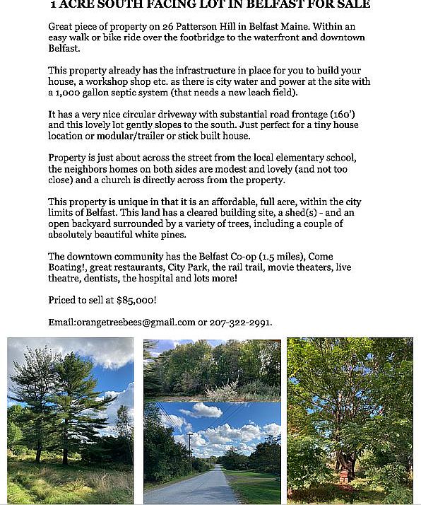 1 ACRE SOUTH FACING LOT IN BELFAST FOR SALE Great piece of property on 26 Patterson Hill in Belfast Maine. Within an easy walk or bike ride over the footbridge to the waterfront and downtown Belfast. Perfect location for tiny house/modular/trailer or stick built house. This is also almost across the street from the local elementary school. This property already has the infrastructure in place for you to build your house, a workshop shop etc. as there is city water and power at the site with a 1,000 gallon septic system. It has a very nice circular driveway with substantial road frontage (160’) and this lovely lot gently slopes to the south. This property is unique in that it is an affordable, full acre, within the city limits of Belfast but out of the noise of the city hub. This land has a cleared building site, a shed and an open backyard surrounded by a variety of trees, including a couple of absolutely beautiful white pines. As you can see the neighbor homes are modest and lastly, the neighbor across the street is a church. :) The downtown community has the Belfast Co-op (1.5 miles), Come Boating!, great restaurants, City Park, the rail trail, movie theaters, live theatre, dentists, the hospital and lots more! Priced to sell at $95,000! Email:orangretreebees@gmail.com