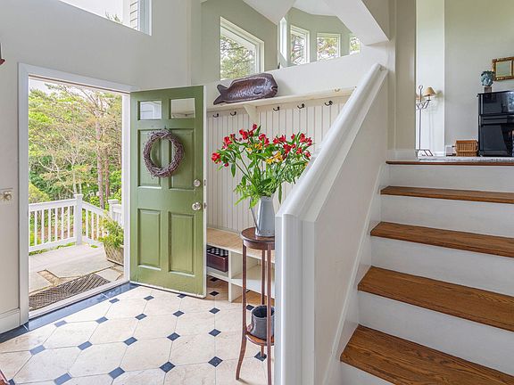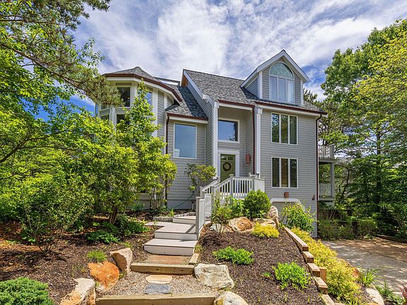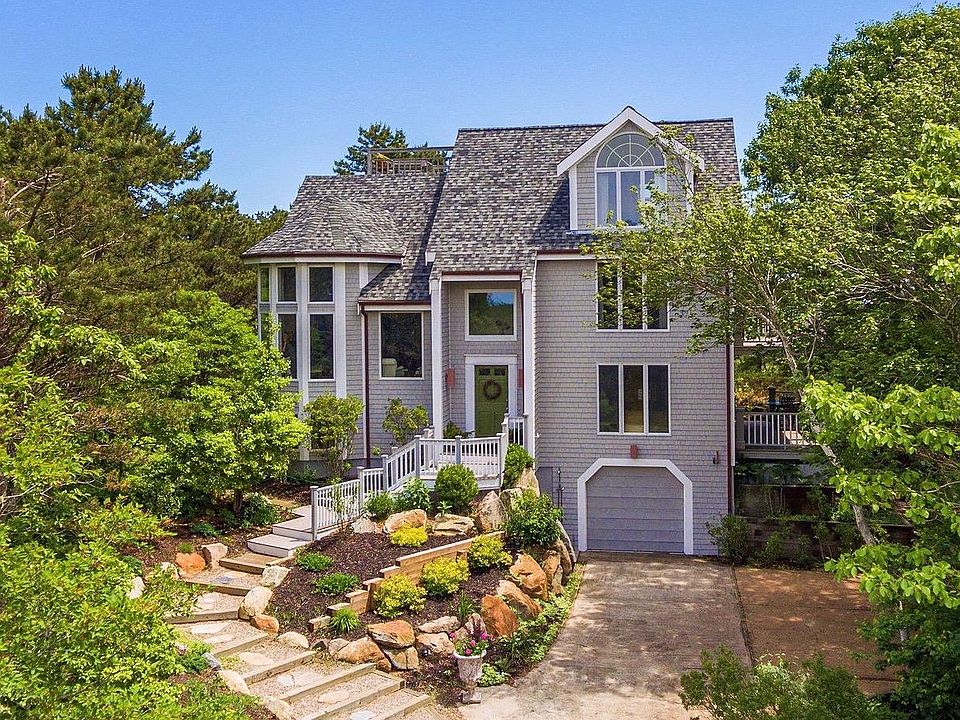 You'll delight in all the light and space offered by this stunning contemporary in the sought-after Pilgrim Heights neighborhood in the West End. The home has an exciting design, with multi level living, soaring ceilings, and open walls. The top two floors comprise a luxurious master suite, with skylights that feature water views, a walk in closet, a marble bath with an oversized walk-in shower, and a sitting room. The middle levels are home to the kitchen, dining and living rooms and also have access to several decks. On the entry level, find a guest suite with bath, a cozy office with rich built-ins, and a half level down takes you to two more bedrooms and a lovely marble bathroom. The lovingly maintained property has a new roof, new siding, an irrigation system, new flooring, gas fireplace, and a one car garage. The home abuts picturesque conservation land, and you'll enjoy the beautiful 360 views from the roof top deck from which you can see the ocean and the harbor.