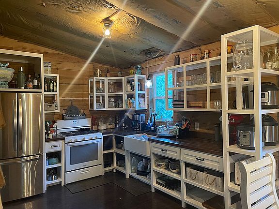 Mostly finished home on 3+ acres. Custom cabinets, barn doors, unique designs, rustic wood walls and open for finishing touches. Fully fenced pasture and animal pens. Two sided pole barn with feed room. Large chicken coop and run. Property needs a little TLC and home needs finish work.