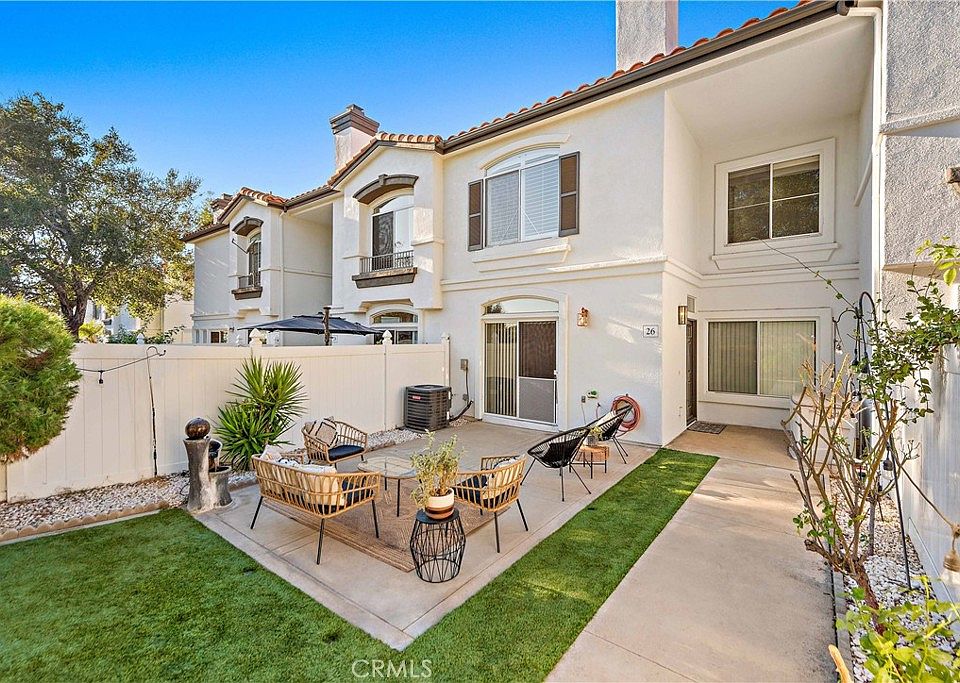 Welcome to this nicely updated and freshly painted 2-story condo, located in the highly desirable Bella Ventana Community of Rancho Santa Margarita. With no neighbors above or below, this condo provides a unique combination of style, space, and privacy. The expansive, fully-gated yard features a large concrete patio, low-maintenance artificial grass, and a rose garden. The yard backs directly to a peaceful canyon, showcasing stunning mountain views that create a serene retreat right in your own backyard. Beautifully upgraded kitchen features granite countertops, a stylish glass mosaic backsplash, crisp white cabinets with updated hardware, and stainless steel appliances- all included in the sale! Kitchen flows seamlessly into the open-concept dining area and living room, where you'll find elegant crown molding, a cozy fireplace, Travertine tile flooring, and a sliding glass door leading to the lush entertainer’s backyard. The first floor also includes a large storage closet, a nicely upgraded half-bathroom w/ new vanity, and direct access to the 2-car garage. The upstairs primary suite features stunning canyon views, plantation shutters, laminate flooring, two spacious closets, and a spa-like en-suite bathroom with dual vanity sinks. Down the hall, you will find the lovely 2nd bedroom, as well as a secondary full bathroom. The attached garage offers an epoxy floor, extra storage space, and laundry hookups- washer/dryer included in the sale. New HVAC and PEX plumbing added in the past 3 years! Ideally situated within the complex, this home offers easy access to the Tijeras Canyon running trail, just steps from your private yard, and is within walking distance to the Mesa Linda Park and St. Serra Catholic School. As part of the RSM Master Community, you'll enjoy an array of resort-style amenities, including: tennis, pickleball, volleyball & basketball courts, pools, baseball fields, picnic areas, a Beach Club & Lagoon at the RSM Lake, additional scenic parks, trails, and more! Located just minutes away from the toll road, shopping/ dining, the Tijeras Creek Golf Course, and additional top-rated schools, this home truly has it all- style, comfort, and an unbeatable location. Schedule your private tour today and experience RSM at its finest! Low taxes rate with no mello-roos.