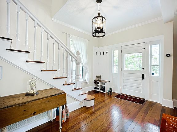 Historic Elegance Revived: Charming 4-Bedroom Home with timeless appeal in the heart of Henry Flagler's original neighborhood. This enchanting residence, circa 1910, stands as a testament to Saint Augustine's rich history. Beyond the white picket fence and landscaping, discover a meticulously restored four-bedroom, two-bath home that seamlessly merges the allure of its historic era with modern conveniences. A welcoming entry sets the tone, leading to a spacious living room adorned with a gas fireplace, built-in bookshelves, and an eye-catching staircase, showcasing the timeless charm of this two-story downtown home. The newly remodeled kitchen is a chef's dream, featuring quartz countertops, high-end stainless appliances, a state-of-the-art double oven, upgraded cabinetry, custom light fixtures, and breathtaking stained-glass windows. A recently added breakfast nook enhances the space. The formal dining room, adjacent to the kitchen, provides an ideal space for entertaining, boasting crown molding, upgraded lighting, coffered ceilings, and a convenient wet bar. The first level also hosts a full bath, laundry room with doors originating from the Henry Flagler Building, original heart wood flooring throughout, and numerous custom-built-ins. Ascending the eye-catching staircase, the second level reveals a generous master bedroom, three additional bedrooms, and a lavish bath featuring a custom walk-in shower with stained glass transom windows and a seamless glass enclosure. Situated on a corner lot, brick- paved walkways, and patios, creating a picturesque setting. while the low-maintenance, pollinator-friendly gardens are thoughtfully irrigated, creating a serene and Eco-friendly oasis. A carriage house and an expansive newly restored, wrap-around porch add to the character and functionality of the property. This home seamlessly combines historic charm with modern luxury.
