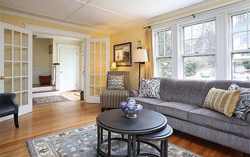 Wellesley Farms. Inviting eight room Colonial on tree-lined street within close proximity to transporation and shops A charming porch leads to an open foyer with French doors to a living room with a fireplace nook. Elegant dining room with built-in cabinetry, spacious den/family room. Bright kitchen with pantry, half bathroom, and seperate entrance to driveway. The second level has four bedrooms, and an updated bathroom. There is a walk-up attic. A finished lower level playroom, TV area, and side porch. Hardwood floors throughout. Young systems and roof. Recently painted exterior. Two-car garage. Perennial gardens.