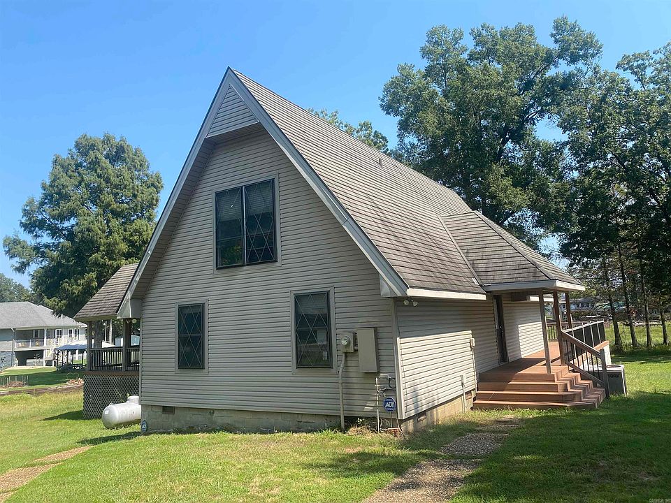 Welcome to “The Cabin” — a beautifully updated A-Frame home offering the perfect blend of rustic charm and modern comfort. Sitting on nearly half an acre with 160 feet of Lake Conway frontage, this 3-bed, 2-bath home is an ideal full-time residence, vacation retreat, or investment property. Step inside to find a bright and open great room with soaring ceilings, wood and tile floors, and a cozy gas-log fireplace. The kitchen is fully equipped with a gas range, updated finishes, and all major appliances included. Both bathrooms feature walk-in showers, and the thoughtful layout provides plenty of space for family and guests. Renovated down to the studs in 2010, this home is move-in ready with updated systems and finishes throughout. Outside, enjoy over 2,400 sq ft of decking with breathtaking water views — perfect for morning coffee or evening sunsets. A private boat slip makes lake life effortless, and the durable metal roof and siding mean low-maintenance living. Located in a quiet neighborhood with paved road access, yet just minutes to town conveniences, this home combines privacy with accessibility.