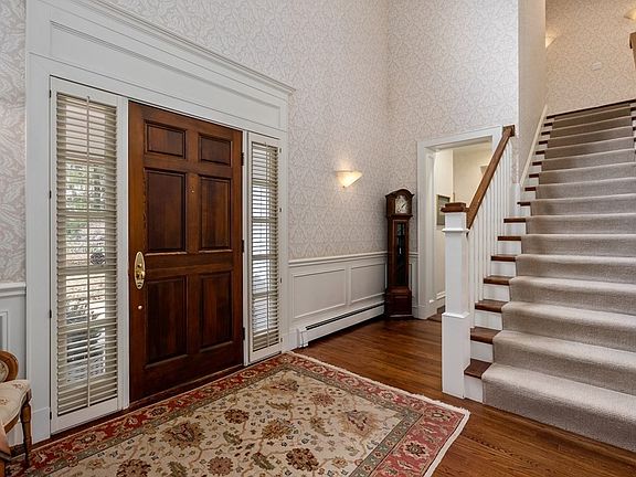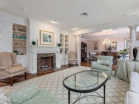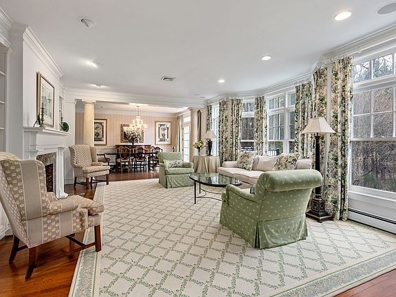 Gorgeous colonial set amidst lush 2.06 acre grounds on private road in prestigious Country Club area offers sun-drenched, beautifully designed space for family living & grand entertaining. A stunning fluted-column covered porch opens to a soaring 2-story beamed foyer that sweeps into living room with bay window, fireplace flanked by elegant built-ins & dining room with doors to spacious deck. Office off living room has bay window & window seat, convenient access to foyer/full bath & French doors to serene bedroom. Gourmet cherry/granite kitchen with island, butler's pantry, breakfast area opens to front-to-back family room with fireplace & window-lined sunroom & doors to deck. Vaulted ceiling primary bedroom is a peaceful retreat with fireplace seating, 2 walk-in closets, spa bath; 3 additional sunny bedrooms, laundry on 2nd floor. Walk-out lower level has media room/fireplace/sliders to patio, gym, full bath, storage & access to 3-car garage. Prime commuter location.