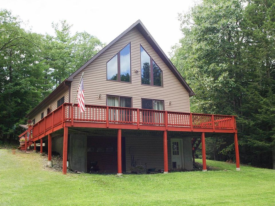 Built in 2000 for the current owner this chalet style home is in excellent condition and well located just outside Chatham Village on a dead-end road. Property is 26+ acres so complete privacy can be expected. An open floor plan has a living room in combination with dining room and kitchen and accented by beautiful cathedral wood ceiling. Two bedrooms including master suite with full bath and walk-in closet complete the first level. On the second level is a large bedroom, den/office and balcony with wonderful view of the woods. Walkout basement is large and dry making a perfect space to create a family room. There is a garage under for lawn equipment, ATV or motorcycle storage, etc. Additionally there is a detached garage and two stall barn. 5 Minutes to Chatham Village and the shops, theatres, restaurants that it boasts. Access to Taconic State Parkway and I-90 are minutes away making New York City, Boston, Albany trips very convenient.